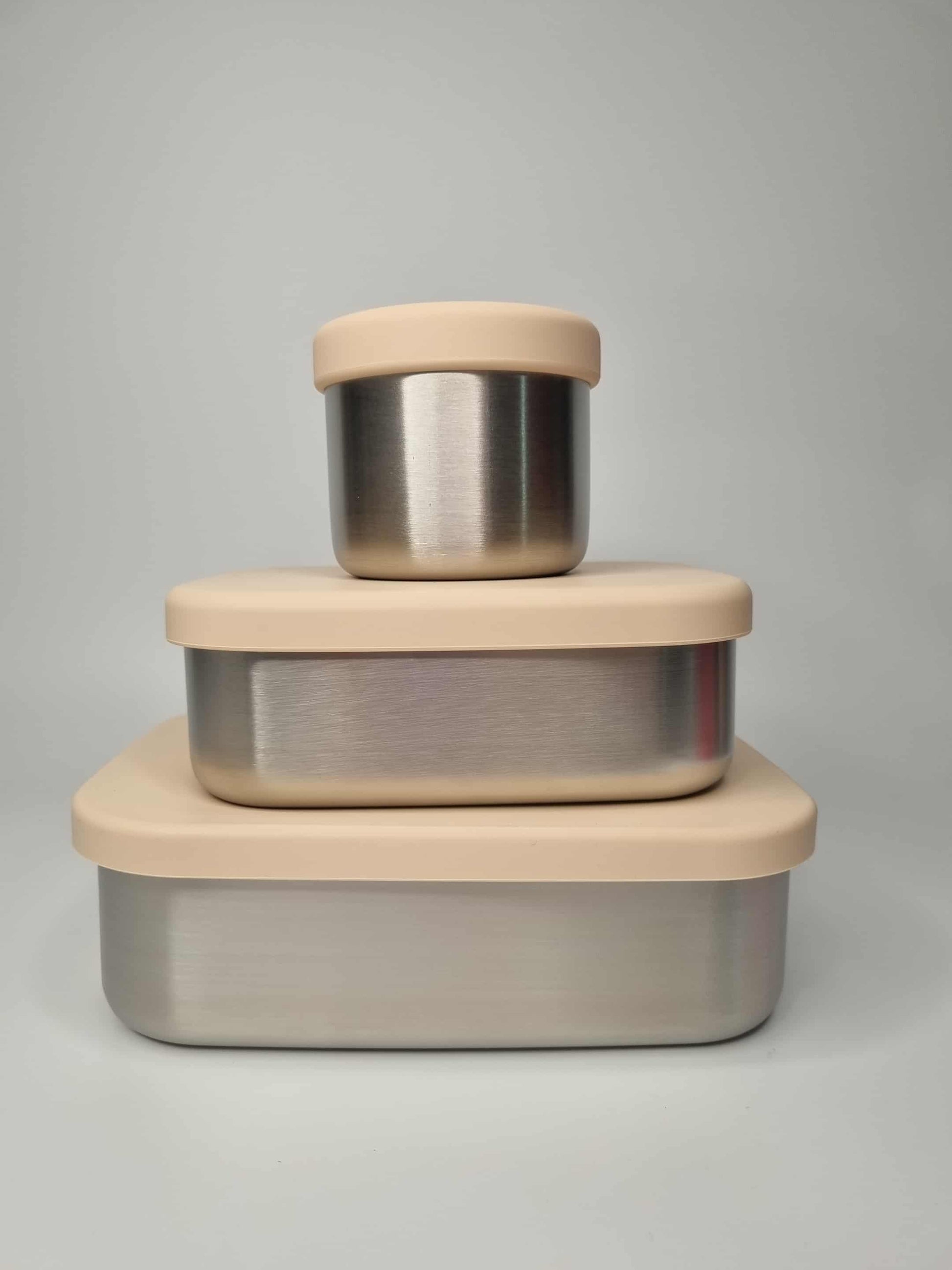 Our Lunchbox Bundle pairs a full-sized stainless steel bento box, a smaller snack-sized bento, and a versatile snack container — all crafted from premium 18/8 food-grade stainless steel with removable silicone lids for easy cleaning and secure seals.