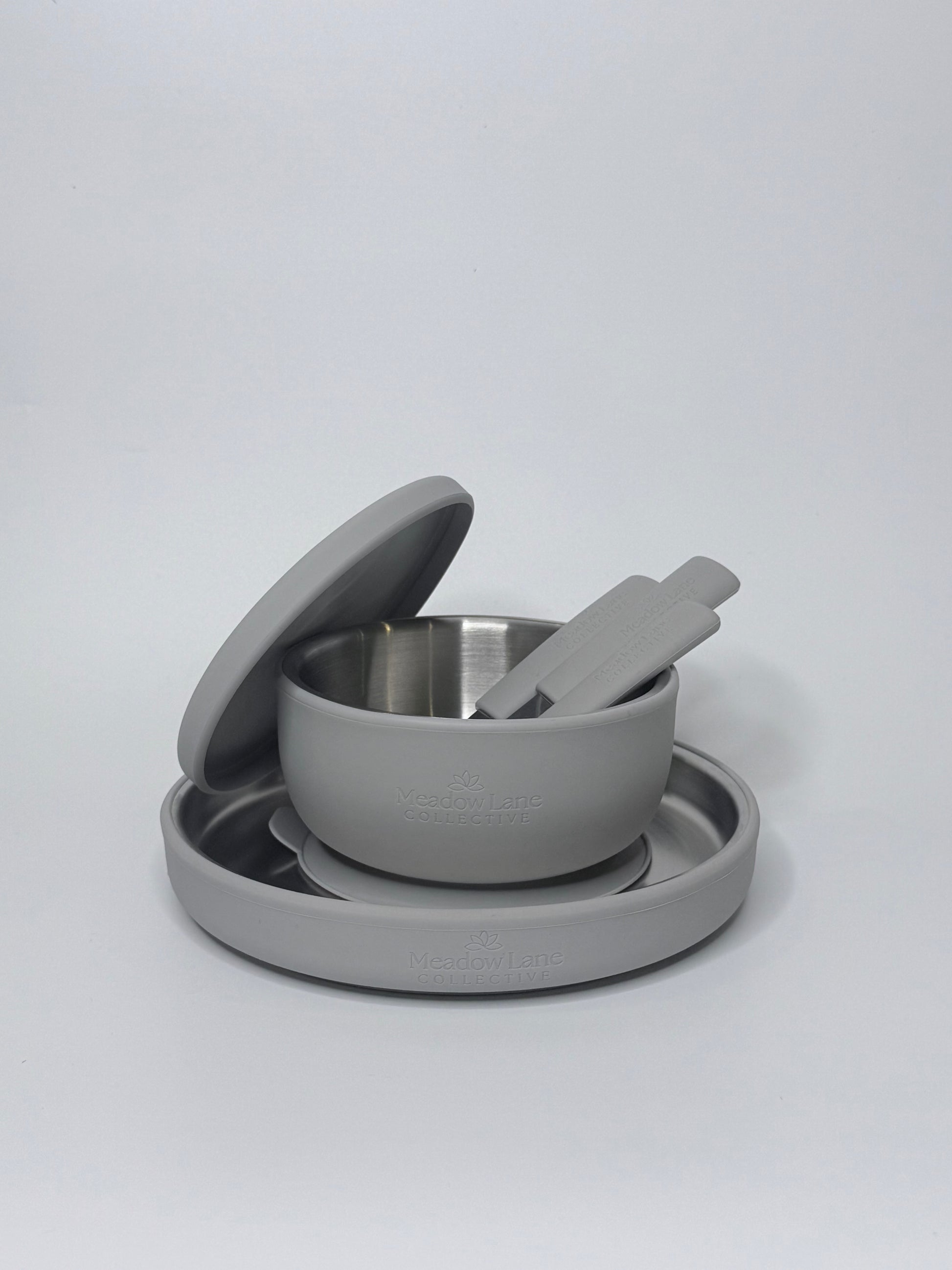 Stainless steel feeding set designed for safer, low-tox mealtimes, supporting independence from first bites through to everyday use.